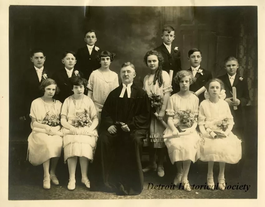 One sepia-toned photograph of a Confirmation Class at St. James Lutheran Church in Detroit. The photo shows three rows of older girls and boys who are seated or standing. Each is holding a Bible along with a certificate that is rolled up and tied with a ribbon or cord. The girls are all wearing white dresses and the boys are wearing dark-colored suits. The pastor, Rev. August G. Bergener, is wearing a clerical robe and is seated at the front center of the photo. A painted backdrop is visible in the background. Several persons in the photo are identified on a separate handwritten note as follows: