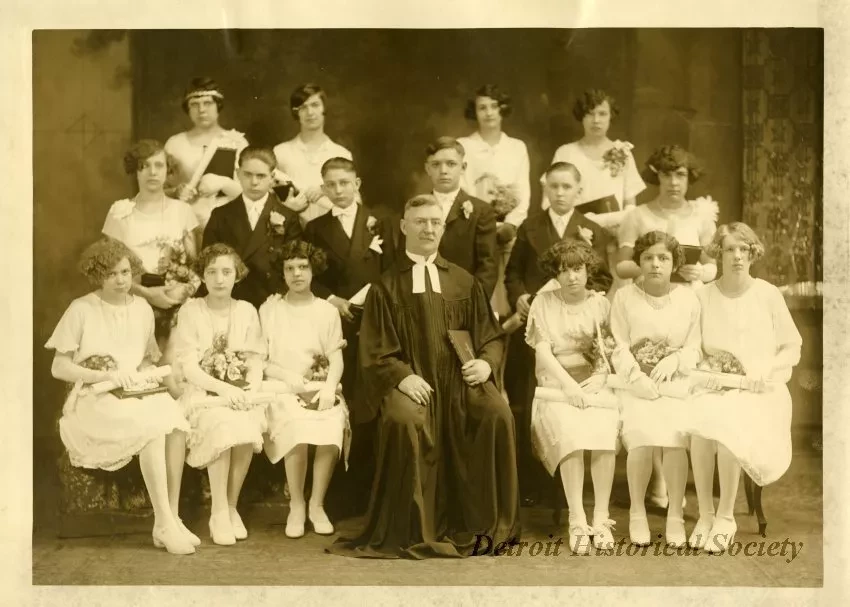 One sepia-toned photograph (and one copy) of the Confirmation Class of 1927 at St. James Lutheran Church in Detroit. The photo shows three rows of older girls and boys who are seated or standing. Each is holding a Bible along with a certificate that is rolled up and tied with a ribbon or cord. The girls are all wearing white dresses and the boys are wearing dark-colored suits. The pastor, Rev. August G. Bergener, is wearing a clerical robe and is seated at the front center of the photo. A painted backdrop is visible in the background. Several persons in the photo are identified on a separate handwritten note as follows: