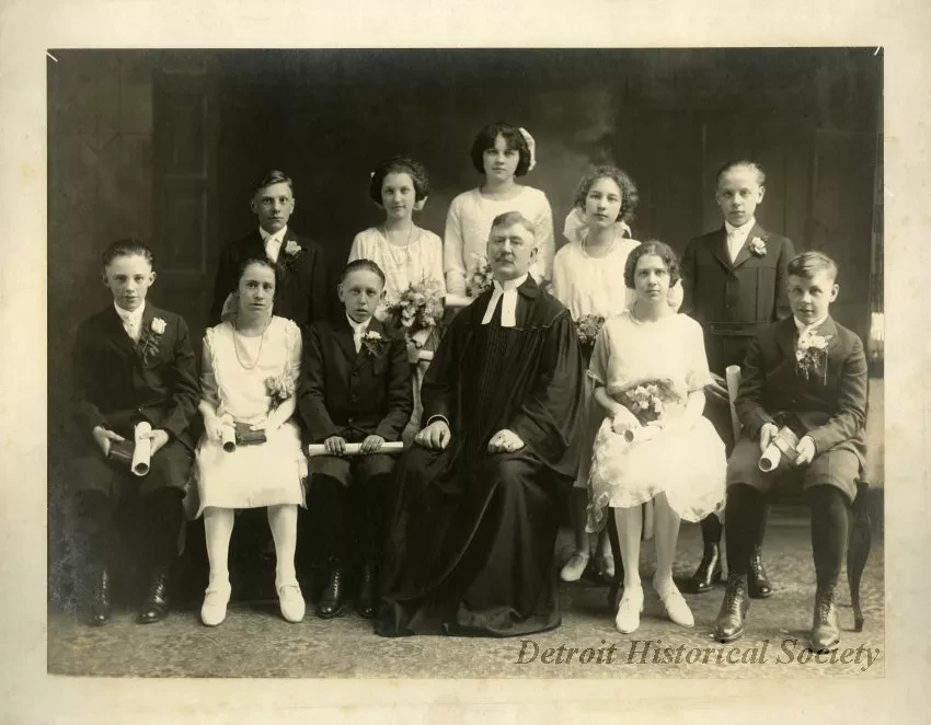 One sepia-toned photograph of a Confirmation Class at St. James Lutheran Church in Detroit. The photo is mounted on white matte board and shows two rows of older girls and boys who are seated or standing. Each is holding a Bible along with a certificate that is rolled up and tied with a ribbon or cord. The girls are all wearing white dresses and the boys are wearing dark-colored suits. The pastor, Rev. August G. Bergener, is wearing a clerical robe and is seated at the front center of the photo. A painted backdrop is visible in the background. Several persons in the photo are identified on a separate handwritten note as follows: