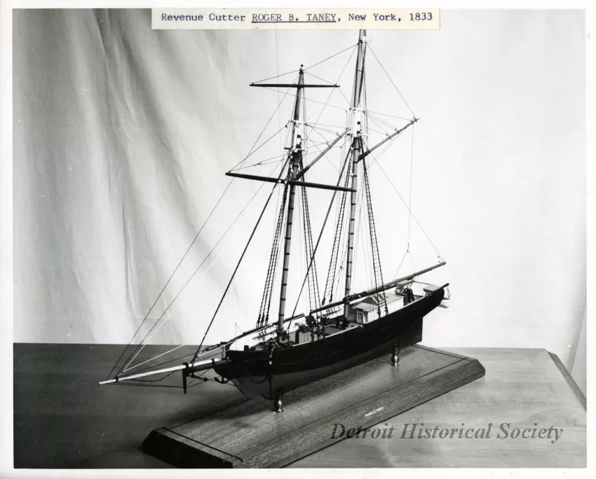 One black and white photograph of a model of the 2-masted revenue cutter, Roger B. Taney. The photograph shows a port side bow view of the model which is mounted on a dark wood base and is resting on a table. No sails are shown on the model and the background is white. A typewritten label at the top of the photo reads "Revenue Cutter, Roger B. Taney, New York, 1833." The model was made by professional model maker, Raymond J. Kaiser.