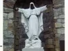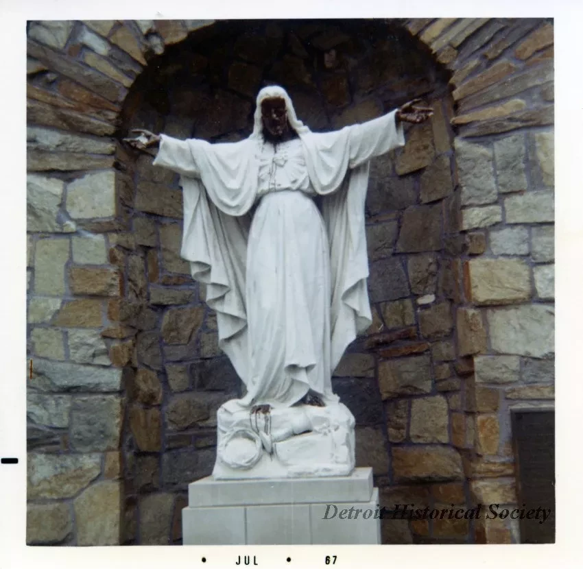 One color photograph of a statue of Jesus with a face, hands, and feet that were painted black during the 1967 Detroit Riot. The white stone statue depicts Jesus in a flowing robe and standing with outstretched arms. It is mounted on a stone base and set in front of a fieldstone grotto. The statue is located at Sacred Heart Seminary near Chicago Boulevard and Linwood Street. A printed black date stamp on the edge of the photo shows "Jul., 67."