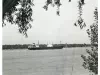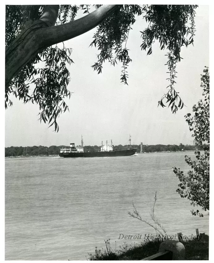 One black and white photograph of the foreign cargo carrier, BILLETAL, of Hamburg, Germany, which is underway in fair weather on the Detroit River. The view looks northward from the Windsor shoreline at Alexander Park. Tall grass, wood posts, overhanging willow tree branches, a small tree, and the Detroit River are visible in the foreground. The upbound steamship and Belle Isle shoreline are visible in the background including the Nancy Brown Peace Carillon which can be seen just ahead of the steamship bow. Handwritten blue ink text on the verso reads 2 1/4 - #D-44-59."