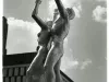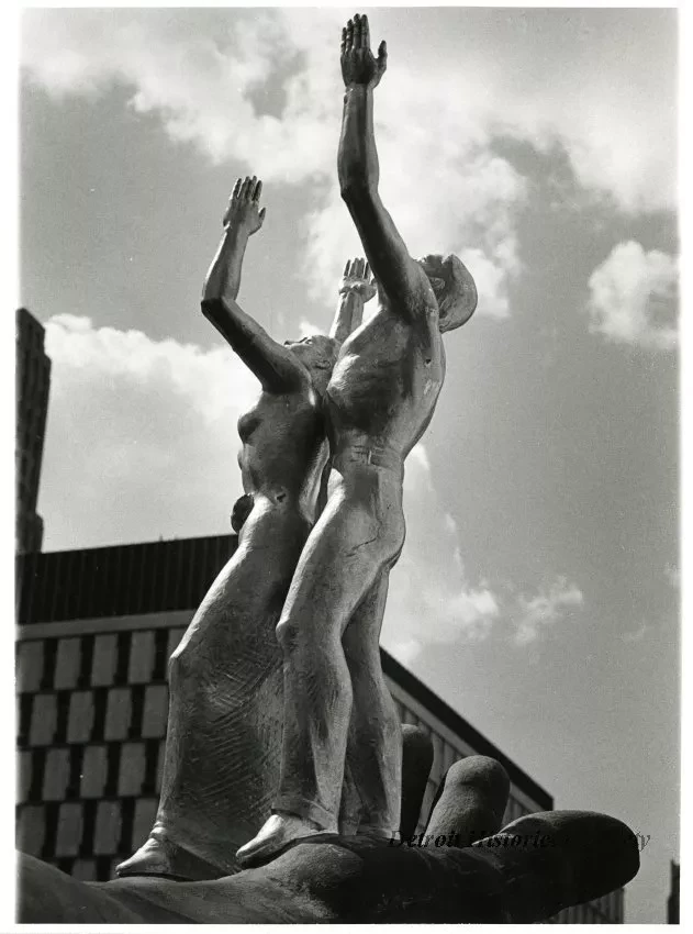One black and white photograph of the outstretched right arm of the Spirit of Detroit statue that is located at the entrance to the City-County Building (now the Coleman A. Young Municipal Center) in Detroit. The view looks slightly upward and shows the bronze hand which holds gold-colored figures representing a young family (man, woman, and a child held in the woman's right arm). The upper floors of the National Bank of Detroit Building can be seen in the background along with a partly cloudy sky. Handwritten blue ink text on the verso reads "35 mm, 36, #23-68," and "Photo Journalism by Laz-U-Rek, 1377 Drouillard Rd., Windsor, Ont., Canada."