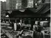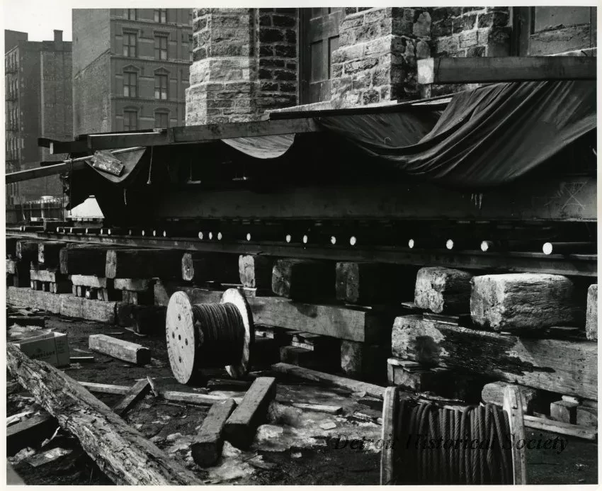 One black and white photograph of Mariners' Church which has been placed on several layers of heavy timber beams, steel beams, and steel rails in preparation for moving the building to a new location. Broken timbers, debris, and two coils of steel cables can be seen on the ground in the lower foreground. Nearby office buildings are visible in the left background.