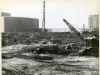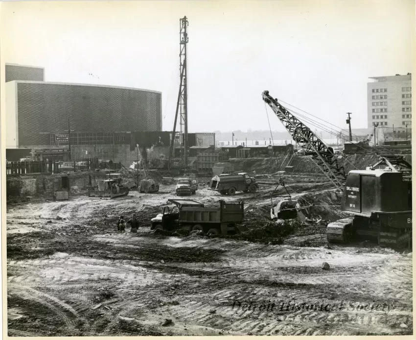 One black and white photograph of construction work that is underway for the new Civic Center redevelopment project near the Henry & Edsel Ford Memorial Auditorium. The view looks southward and shows a large excavated area in the foreground as well as a pile driver, a dragline excavator, construction vehicles and equipment, temporary construction office sheds, and several workmen. The front of the Auditorium can be seen in the left background. The Detroit River and Windsor shoreline are visible in the center background and the Veterans Memorial Building can be seen at the far right..