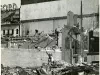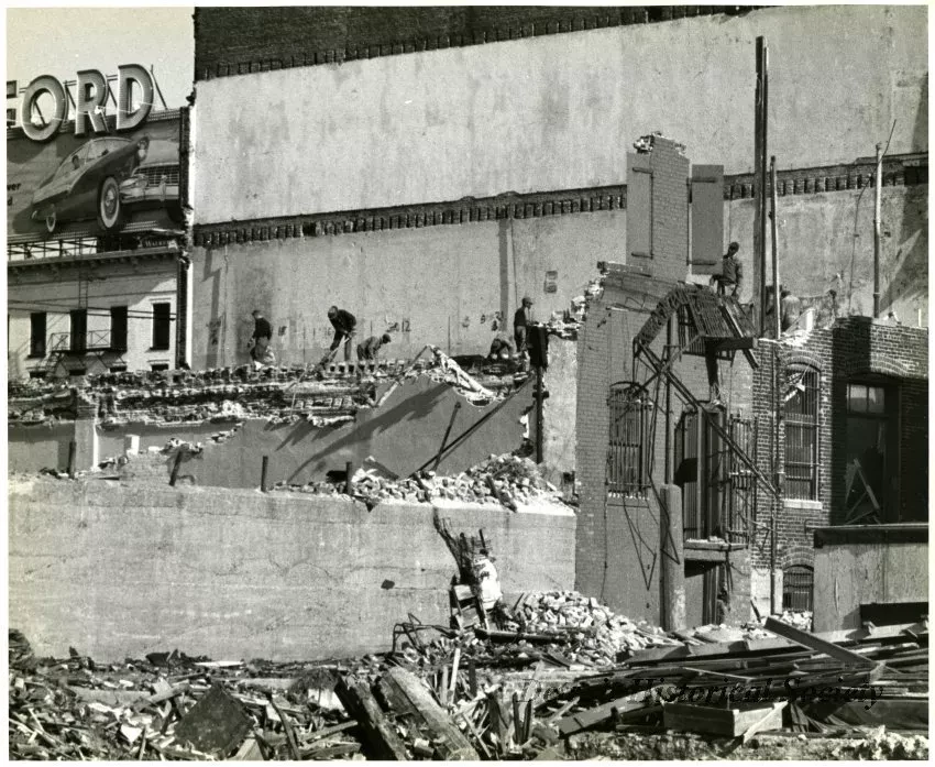 One black and white photograph of the back side of a row of old multi-story brick commercial buildings that are being demolished as part of the Civic Center redevelopment project. The view looks northeastward from Woodbridge Street and shows piles of debris in the lower foreground. The mostly-demolished buildings can be seen in the background along with several workmen who are walking or standing on the top of a wall. A "Ford" billboard can be seen on top of a building that is located on the north side of Jefferson Avenue at the upper left corner of the photo.