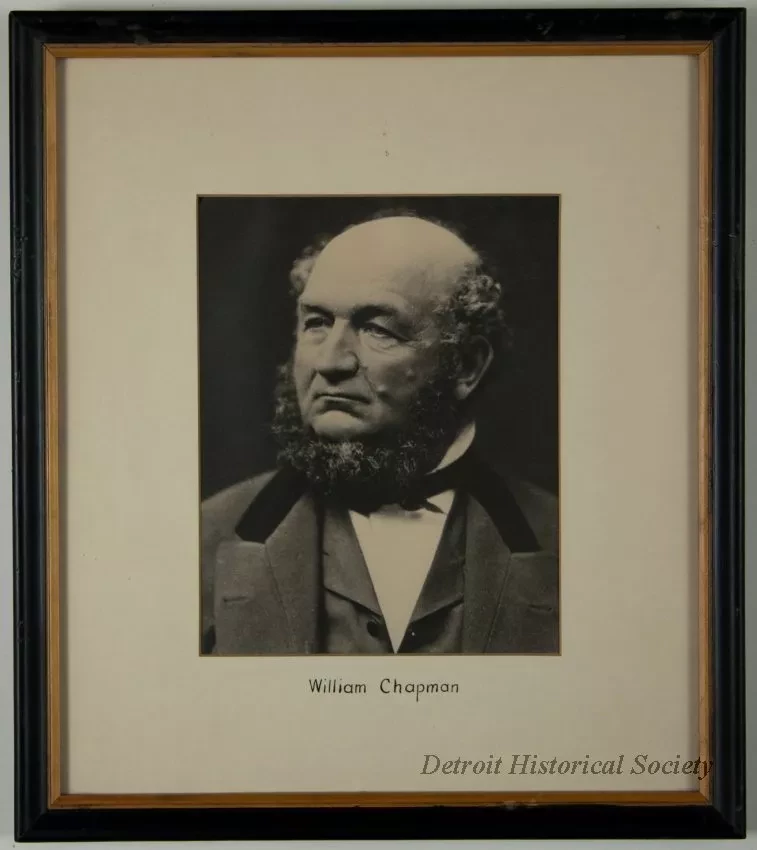 One framed black and white photograph of William E. Chapman, who was the president of the Chapman Wrecking Company of New York. The photo shows a head and shoulders image of the subject who is wearing a gray suit coat and vest with a dark-colored tie and a white shirt. Handwritten black text beneath the photo reads "William Chapman." The photo has a white matte border and is mounted in a decorative black wood frame that has an unpainted (natural wood) inner edge along with protective glass. An adhesive label on the verso indicates that the framing was done by "Hudson's" in 1969.