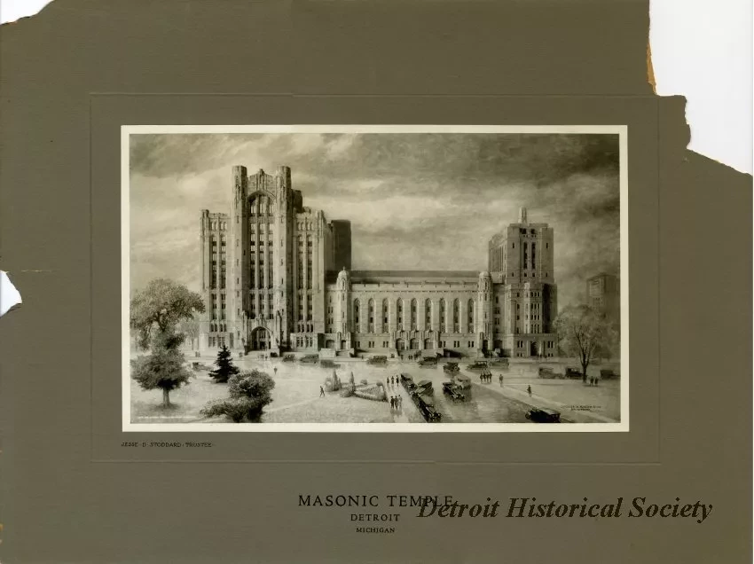 Black and white photographic of an architectural drawing of the Masonic Temple. The drawing depicts the southern side of the Masonic Temple, with a view to the northeast. Many cars are shown driving and parked along Temple Street, in addition to numerous people walking towards the Temple. Text on the lower left corner of the photograph reads "Copr. The Masonic Temple Association of Detroit." Text on the lower right corner of the photograph reads "George D. Mason & Co. Architects." The photograph is mounted on heavy grey board. The board contains the text "Jesse D. Stoddard: Trustee" underneath the bottom left corner of the photograph, and the text "Masonic Temple Detroit Michigan" in the center near the bottom.