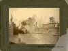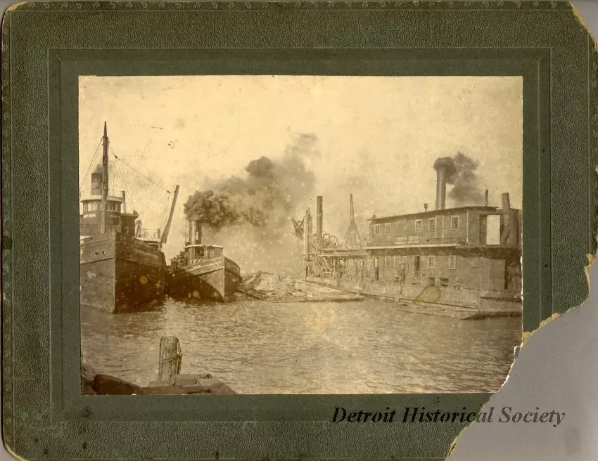 One sepia-toned photograph of the sand boat, Sandy Hook, of the Donnelly Contracting Company (left), tugboat FABIAN (left center), an un-named barge (right center), and the dipper dredge, BRIAN BORU (right), of the Dunbar & Sullivan Dredging Company. Dredging work is underway and the un-named barge is loaded to the gunwales with sand, stone, and other dredged materials. The photo is mounted on an embossed brown/gray matte board frame. Handwritten text on the verso reads "Brian Boru."