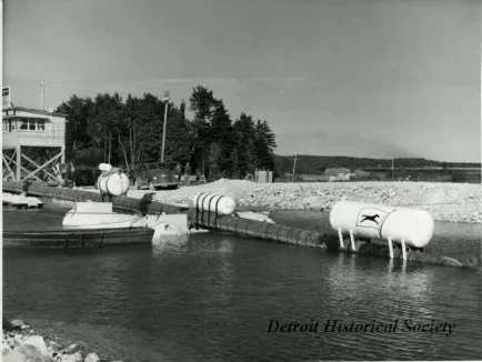 One black and white photograph of the Merritt-Chapman & Scott Corporation construction staging area for the Lakehead Pipeline crossing of the Straits of Mackinac. The photo shows a long section of steel pipeline which is resting on a cradle with rollers at the shoreline and also a floating cradle that is tied to the shore. The end of the pipeline has a large steel float attached to the top which is about the enter the water as the pipe is pulled slowly out toward Lake Michigan. In the left background, a "Control Tower" building can be seen on shore. Evergreen trees and a rip rap breakwater are visible in the center and right background. Black ink stamps on the verso read "Merritt-Chapman & Scott Corp. Photo," and "Sep. 17, 1953." The staging area was located west of St. Ignace, Michigan, at Pointe La Barbe.