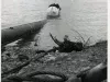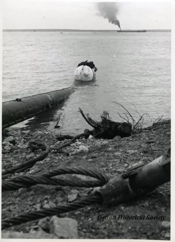 One black and white photograph of the Merritt-Chapman & Scott Corporation construction staging area for the Lakehead Pipeline crossing of the Straits of Mackinac. The photo shows a section of the steel pipeline which has been brought ashore after crossing the Straits. Cables and debris can be seen on the shoreline in the foreground. A white float, lashed to the top of the pipe, can be seen in the center area of the photo. Lake Michigan and a passing freighter can be seen in the background. Black ink stamps on the verso read "Merritt-Chapman & Scott Corp. Photo" and "Sep. 20, 1953."