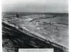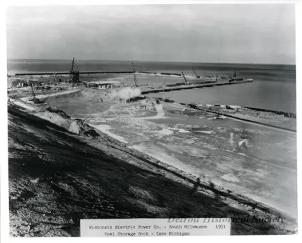 One black and white photograph (and one copy) of a coal storage dock under construction in South Milwaukee for the Wisconsin Electric Power Company. The elevated view shows the project site in the foreground with large areas of earth excavation, seawall construction along the Lake Michigan shoreline, and industrial building construction. Cranes, construction equipment, and piles of supplies can be seen across the site with Lake Michigan being visible in the background. It appears that the earth is lightly covered with snow. The construction work was done by the Merritt-Chapman & Scott Corporation. A typewritten label along the lower edge reads "Wisconsin Electric Power Co. - South Milwaukee, 1951, Coal Storage Dock - Lake Michigan."