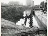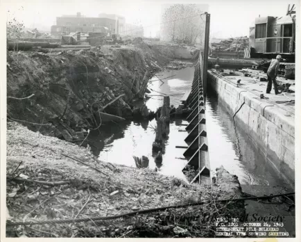 One black and white photograph showing a new seawall under construction along the Chicago River. The photo shows steel bracing along the back side of a new seawall that has not yet been backfilled with earth. Old timber pilings and debris can be seen along the embankment at the left side of the photo and a crane barge can be seen on the river at the right side. A typewritten label near the lower right corner reads "Time, Inc., FC 1201, October 24, 1963, Steel Sheet Pile Bulkhead, General View Showing Sheeting." A black ink stamp on the verso reads "Calumet Studio, Arthur P. Stalla, SO 8-1951, Reorder No. FS6329."