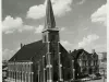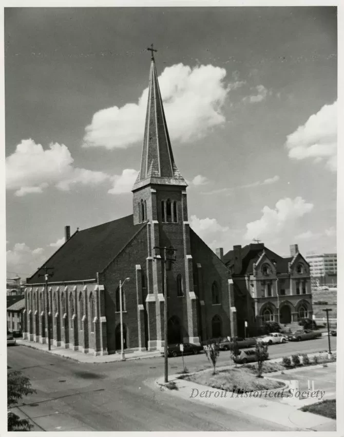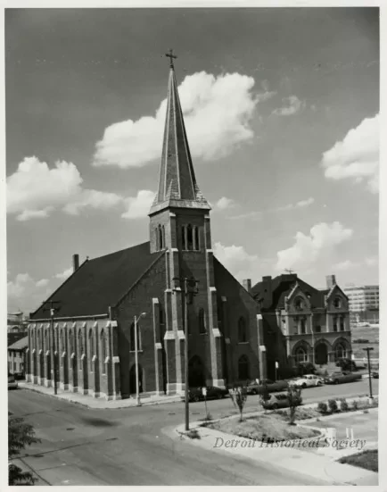 Black & white photographic print depicting Most Holy Trinity Catholic Church on the northeast corner of Porter and 6th Streets. Several cars are parked in front.