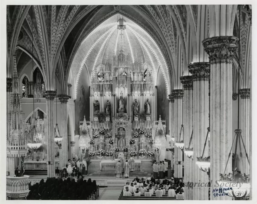 Request ImageBlack & white photographic print depicting a view inside Sweetest Heart of Mary Catholic Church, looking from the nave towards the apse.