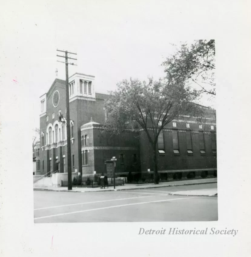 Black & white photographic print depicting Immaculate Conception Catholic Church on the southwest corner of Trombly and Moran Streets.