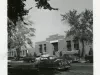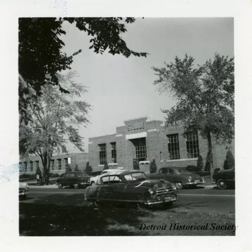 Black & white photographic print depicting St. Jude Catholic School on the north side of E 7 Mile Road between Rex Avenue and Redmond Street. Parked cars line the street.