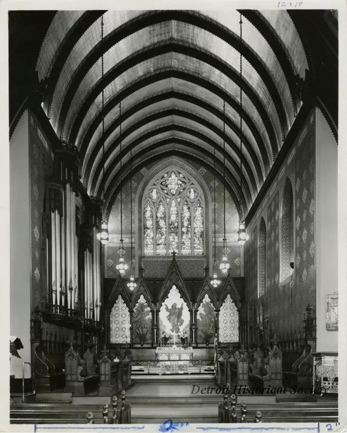 Black & white photographic print depicting the interior of Christ Church Detroit, looking from the nave toward the altar. Handwritten on verso: after renovation 1952