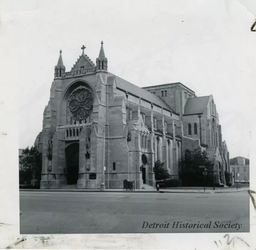 Black & white photographic print depicting St. Paul's Episcopal Cathedral on the northeast corner of Woodward Avenue and E Hancock Street.