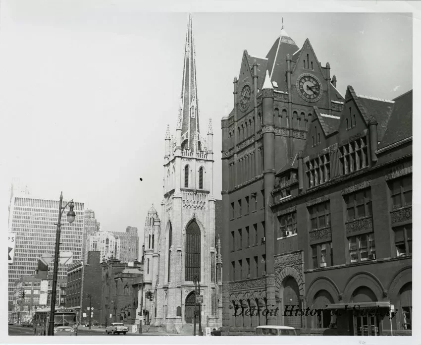 Black & white photo depicting buildings along the south side of W Fort Street, looking east from near 3rd Street. In view are the Fort Street Union Station, Fort Street Presbyterian Church. In the background are the Detroit Bank & Trust Building, Buhl Building, and Guardian Building.