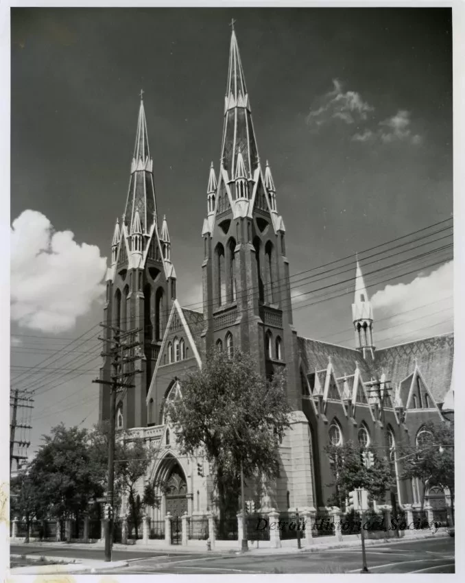 Black & white photo depicting Sweetest Heart of Mary Catholic Church on the northeast corner of Russell and E Canfield Streets.