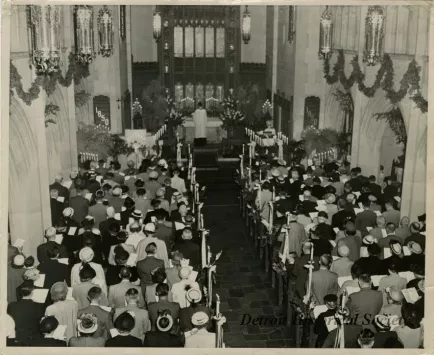 Request ImageBlack & white photo depicting the inside Trinity Lutheran Church, looking from the balcony toward the altar during a service.