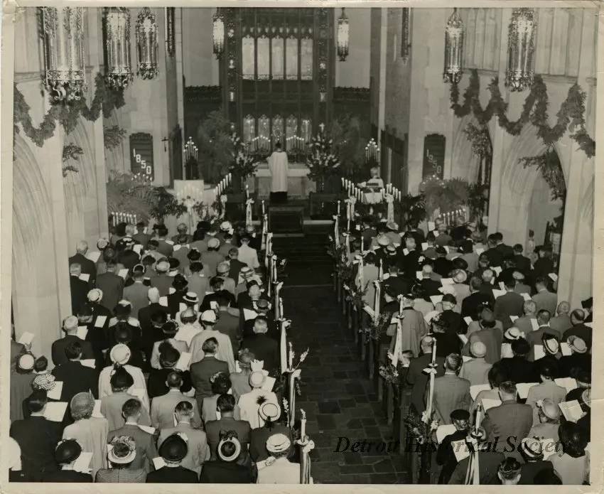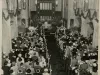 Black & white photo depicting the inside Trinity Lutheran Church, looking from the balcony toward the altar during a service.