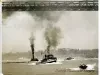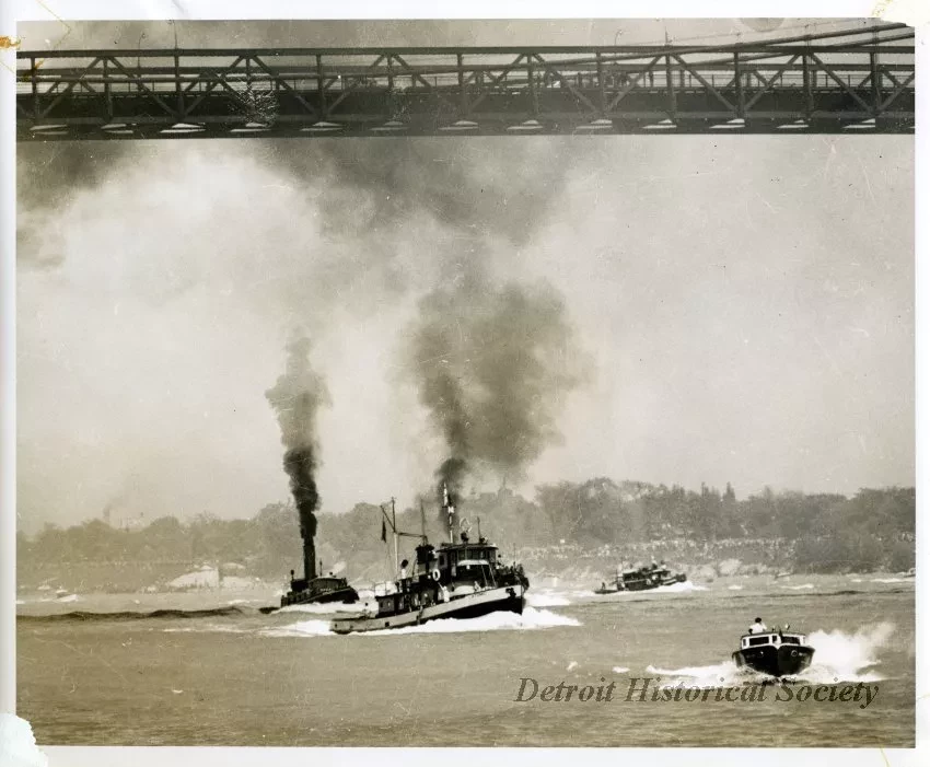 One sepia-toned photograph of the first international tugboat race on the Detroit River. The center area of the photo shows three tugboats downbound on the river in fair weather. The vessel at the left is the OREGON of the Great Lakes Towing Company, and the ATOMIC of McQueen Marine, Ltd., can be seen at the center. The name of the tug in the right background is unreadable. The race was won by the ATOMIC. Many spectators can be seen on the Windsor shoreline in the background and the Ambassador Bridge is visible overhead. One spectator vessel can be seen on the river in the lower right foreground. An adhesive label with typewritten text on the verso reads "Boats - Races - Tugboats, Won by Atomic (R.C.), 5-20-50." An adjacent blue ink stamp reads "Photograph by The Detroit News, Not to Be Published."