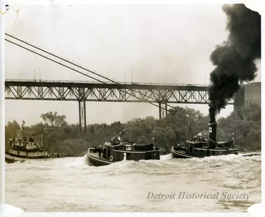 One sepia-toned photograph of the fifth international tugboat race on the Detroit River. The center area of the photo shows three tugboats upbound on the river in fair weather. The vessels are identified as follows (left to right): ATOMIC of McQueen Marine, Ltd., MARYLAND of the Great Lakes Towing Company, and WISCONSIN of the Great Lakes Towing Company. Many trees can be seen on the Windsor shoreline in the background and the Ambassador Bridge is visible overhead. An adhesive label with typewritten text on the verso reads "Boats - Races - Tugboats, Won by Atomic, 5-22-54." An adjacent blue ink stamp reads "Photograph by The Detroit News, Not to Be Published."