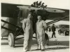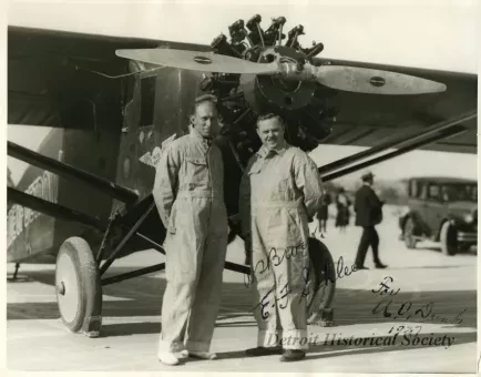 Request ImageBlack and white photographic print depicting Edward F. Schlee and William S. Brock standing in front of a Stinson Detroiter called the PRIDE OF DETROIT.