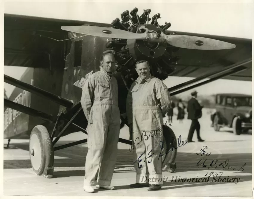 Black and white photographic print depicting Edward F. Schlee and William S. Brock standing in front of a Stinson Detroiter called the PRIDE OF DETROIT.