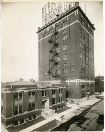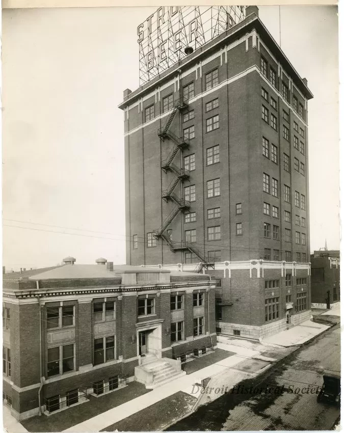Black and white photographic print (and one 8" x 10" copy and two negatives) of the Stroh Brewery Company brewhouse flanked by the Stroh office building. Atop of the brewhouse is a large sign reading "Stroh's Beer." The original print is mounted on fabric with two hole punches on the top of the image.
