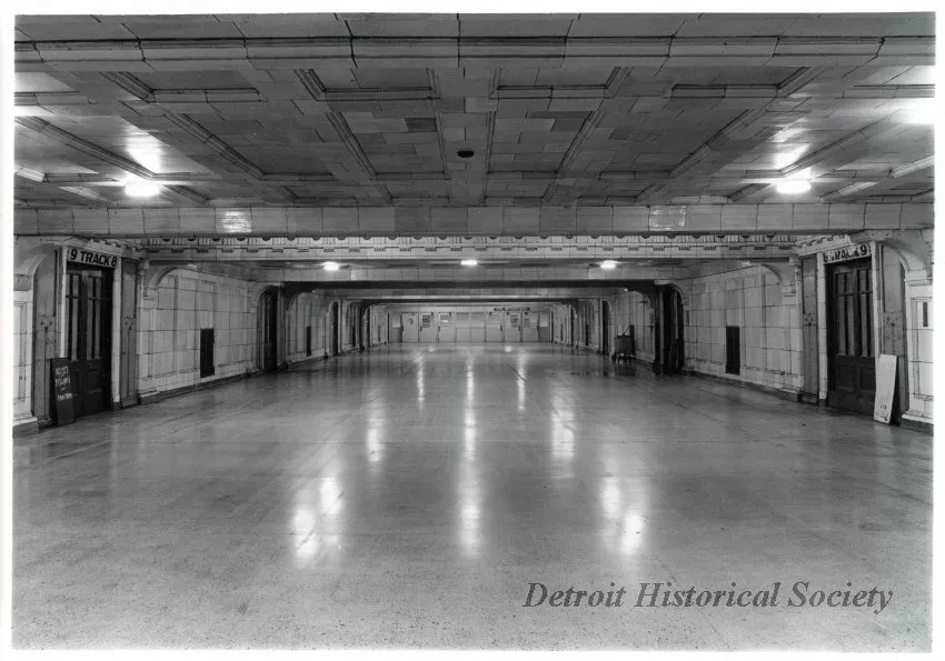 One black and white framed photograph (and one unframed copy) which shows an image of the underground corridor that is located beneath the railroad tracks at the Michigan Central station in Detroit. The wide corridor provides passenger access between the station and the track platforms. The view shows the polished marble floors as well as the decorative overhead stonework and lighting. Doorways can be seen along the left and right sides of the corridor which lead to stairways up to the various track platforms. The photo is held in a white matte board frame.