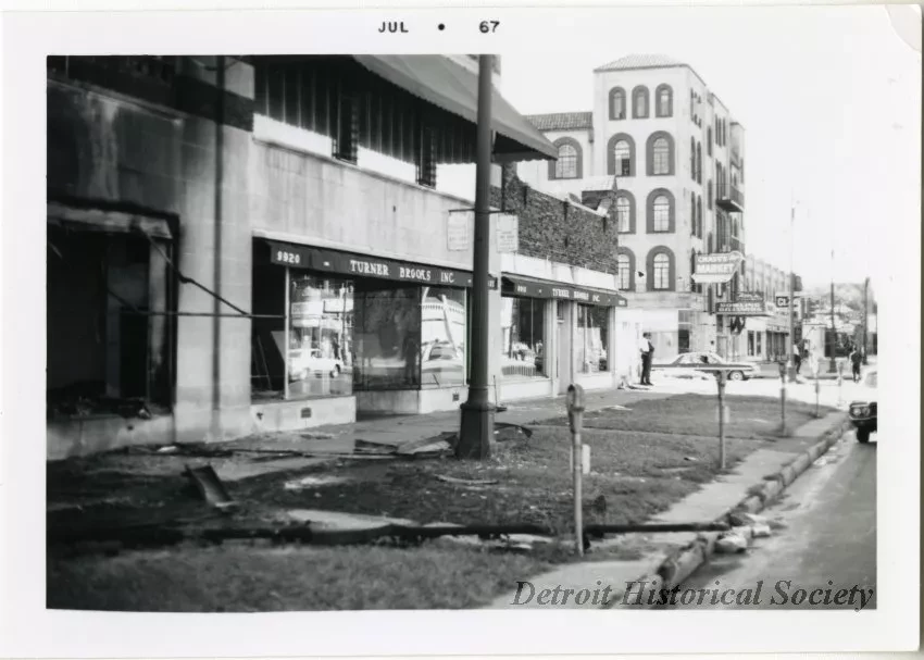 Black and white photo of a destroyed business on the northeast side of Dexter Boulevard, next to Turner Brooks Inc. (9920 Dexter). In the background, southeast of West Boston Boulevard is the Dexter Recreation Building. Signs on it promote the Chase's Market, and bowling and billiards within. "Jul 67" is printed in the photo's border.