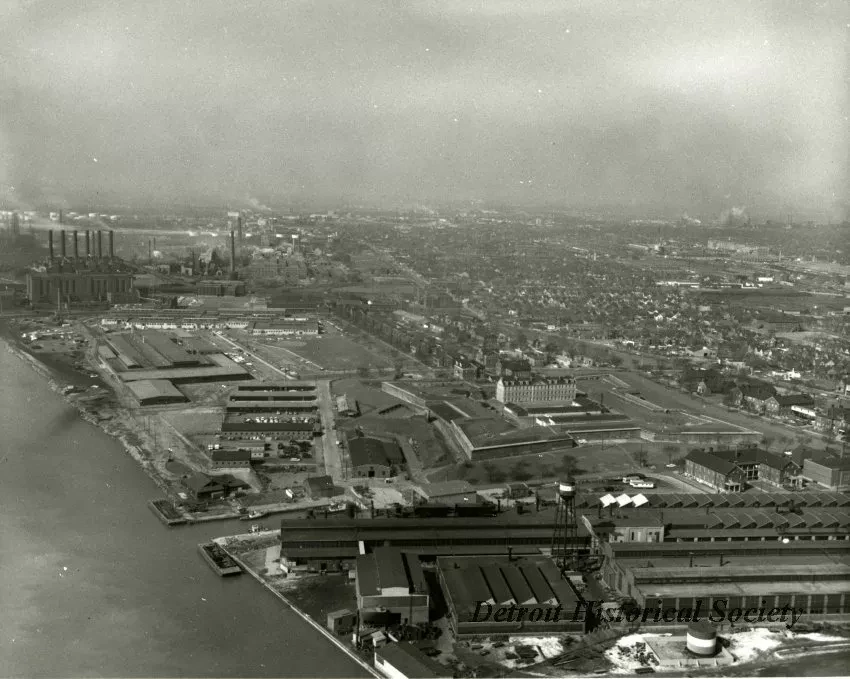 Request ImageA black and white aerial photo of Historic Fort Wayne viewed from the north. Fort Wayne is visible in the center foreground.
