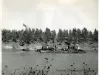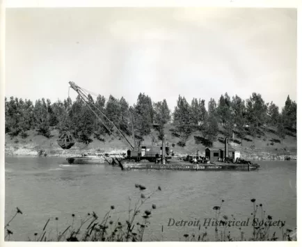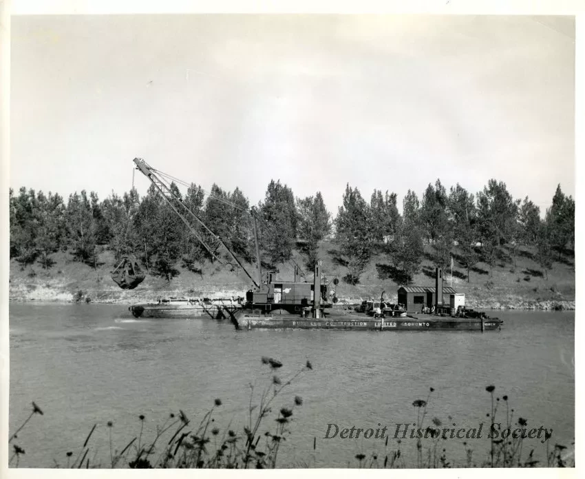 One black and white photograph of two barges and a crane. The barge in the foreground has a Manitowoc crane mounted on its deck and is using a 5 cubic yard clamshell bucket for dredging work on the Welland Canal. This barge has white painted text on the side that shows "Russell Construction Limited, Toronto," with the name, "Sir Andrew," near the transom. Dredged material is being placed into the second barge that can be seen in the background along with a shoreline. Handwritten red pencil text on the verso shows "D-5RN" (dredging bucket - 5 cubic yard, round nose).