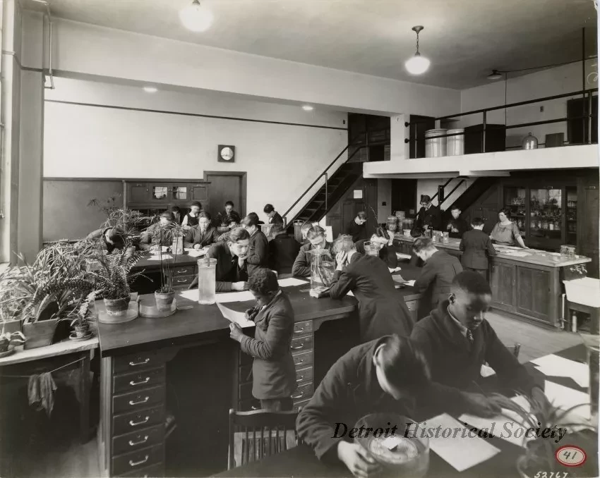 Black & white photo depicting students working in a biology lab at Cass Technical High School.