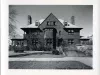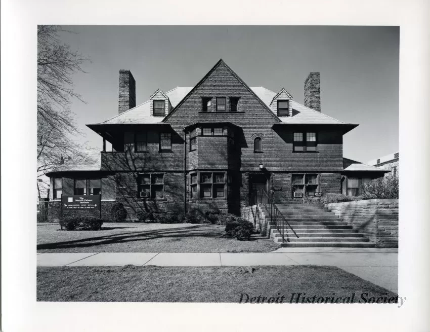 Black and white photograph of the front face of the Charles Freer house located on 71 East Ferry Avenue. The photograph contains the image of the front of the house with a sign on the front lawn that states "The Merrill-Palmer Institute". "Charles Freer House, 71 East Ferry Detroit Michigan. Photograph by Dave Jordano 1973 Archivally Processed" is handwritten on verso.