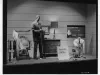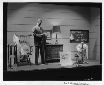 Print. Black and white photographic print of a window display featuring men's suiting available at The J.L. Hudson Company Department Store. A male mannequin, dressed in a suit, holds a pair of dress pants, and is featured amongst home furnishings which include a chair, dresser and illuminated lamp. A mannequin bust on the right side of the display also features male clothing including a patterned vest, dress shirt and necktie. A fedora, wing-tip shoes, belt, and argyle socks are adjacent to the bust. A rack of patterned neckties is visible in the far left foreground of the display with signage that reads, "Fabric and Color Interest, Silk grenadine in color panels for any suit, $3.50." Signage, which includes fabric swatches is affixed to the rear of the display and reads, "Compound Colors with the Nubby Touch." Also, signage in the central foreground reads, "Compound Colors with the Nubby Touch, take your cue from the annual Autumn colorama, wear the clothes you've wanted to wear for years! Men's Store, 2nd Floor, Woodward Section E." The photographic sequence number, company name, and photographer's name are printed on the bottom of the recto, "25743-4x; The J.L. Hudson Company; Photography by Davis B. Hillmer."