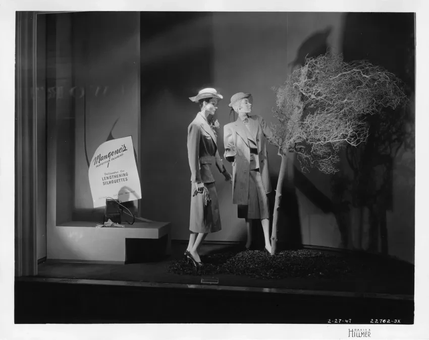 Print. Black and white photographic print of a window display featuring ladies tailored suiting available at The J.L. Hudson Company Department Store. Two female mannequins are featured in the display; both are dressed in pin-striped suits, which include calf-length skirts, jackets, and overcoats. Also, the ladies are accessorized with birdcage hats, broaches, gloves, and footwear. The ladies are displayed standing atop foliage and neighboring a leafless tree. A small platform in the left corner features more ladies accessories including handbags. Signage on the left side of the display reads, "Mangone's Perfection Tailoring, Delineates the Lengthening Silhouettes, Suit Shop, Sixth Floor, Grand River." The date, photographic sequence number, and photographer's name are printed on the bottom of the recto, "2-27-47; 22762-3x; Davis B. Hillmer."