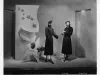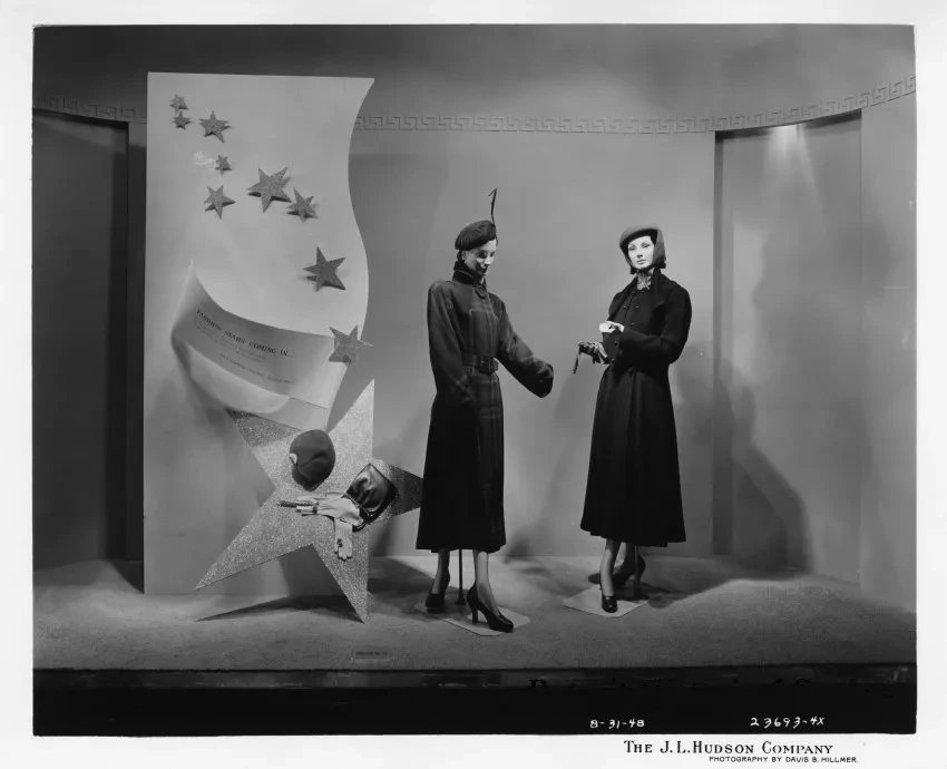 Print. Black and white photographic print of a window display featuring ladies outerwear fashions available at The J.L. Hudson Company Department Store. Two female mannequins are featured in the display wearing calf-length overcoats, the left mannequin is wearing a plaid coat with a belted waist, and top button enclosure; the right mannequin is wearing a dark-colored jacket with large lapel, button detailing on the bodice, and cinched at the waist with a belt. A large ornamental board with glittery stars is displayed adjacent to the mannequins; affixed signage reads, "Hudson's and Vogue See Fashion Stars Fashion Stars Coming In The Dolman-Sleeved, Belted Coat by Philip Mangone; The High-Rising Cape Collar on a Fitted Coat by Gershel, Woodward Shops, Seventh Floor." The date, photographic sequence number, company name, and photographer's name are printed on the bottom of the recto, "8-31-48; 23693-4x; The J.L. Hudson Company; Photography by Davis B. Hillmer."