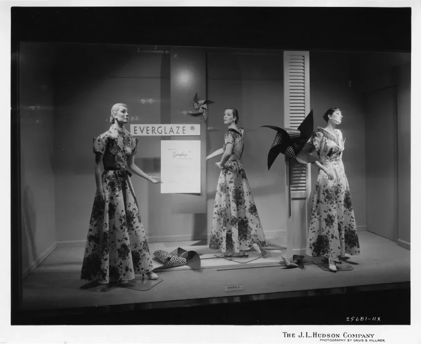 Print. (2 Copies.) Black and white photographic print of a window display featuring ladies loungewear available at The J.L. Hudson Company Department Store. Three female mannequins are featured in the display; each is donned in a floral patterned, floor length ladies loungewear robe with belted or sashed waists, as well as notched or shawl collars and cuffs. Patterned pinwheels ornament the window. Signage affixed to the rear of the display reads, "Everglaze, Because It's Everglaze, It Stays and Stays! Enjoy more leisure hours with these Everglaze charmers, minimum-care Hostess Robes styled by Kamore, Loungewear, 6th Floor, Woodward Section D." The photographic sequence number, company name, and photographer's name are printed on the bottom of the recto, "25681-11x; The J.L. Hudson Company; Photography by Davis B. Hillmer." The date is hand-written on the verso, "April, 1953."