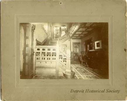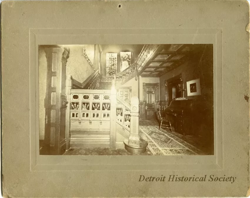 One sepia-toned photograph of the entry foyer and stairway in a residential home located at 25 West Canfield Street in Detroit. The photo shows a decorative carved wood column and balustrade at the stairway landing in the left foreground. Wood paneling can be seen along the stairway in the background and two large stained glass windows are visible at a mid-stair landing in the upper background. An Oriental rug can be seen on the spacious foyer in the right foreground. A roll-top desk and chair and doorway can be seen at the right side of the photo. Two closed doors are visible at the far end of the foyer in the background. The photo is mounted on a tan/gray matte board frame. Handwritten black ink text on the verso reads "25 Canfield Ave. W., Detroit, Mich."