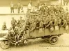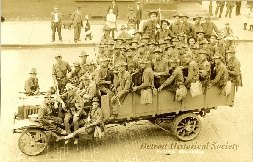 Sepia tone photograph of the Detroit Light Guard Company C, 1st Michigan National Guard, during the Upper Peninsula copper strike of 1913. Regiment commanded by Captain George Waldo, seated in middle of front seat. Image shows uniformed soldiers on a large chain-driven truck. Company C flag flown from far side of truck. Civilian bystanders in background. Mounted to heavy grey board, embossed on front "Stechbauer, Calumet, Mich."