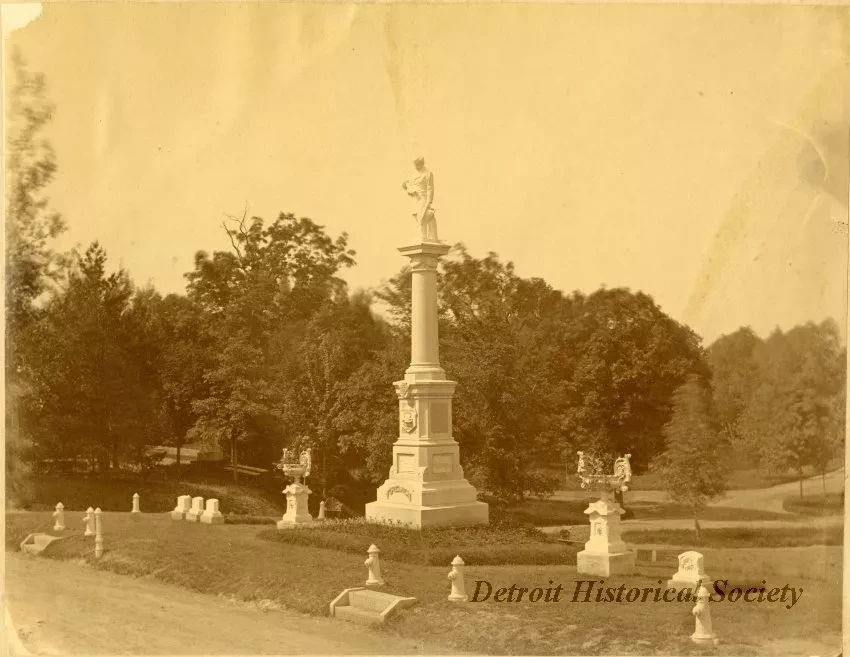 Sepia-toned albumen photo of the Firemen's Memorial in Elmwood Cemetery. The Memorial consists of a round white stone column (probably marble) that is mounted on an ornate carved, 4-sided white stone base. A carved figure of a fireman, who is shown with a downcast gaze, is standing on top of the column. The front of the base shows a raised carving of a fireman's helmet and the lettering, "Firemen." A planted flower bed occupies the area around the monument base. Also, there are two large flower urns on each side of the monument. Several ornamental fire hydrants are visible in the foreground and gravestones can be seen in the area beyond the flower bed.