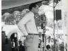 One black and white photograph of a man who is standing on a stage behind a WJR microphone. He is standing with his right hand in his back pants pocket and is looking straight ahead. The crowd in the background includes children and adults. A WJR bus can be seen behind the crowd. Brown ink stamp on verso states, "Pinney Studio, Brighton." Handwritten text on verso states, "WJR at State Fairgrounds."