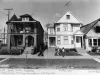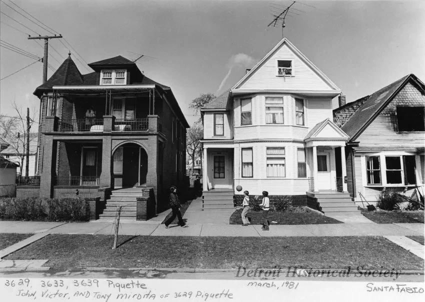 Black and white photographic print mounted on board depicting houses on the 3600 block of Piquette Avenue, the house on the right damaged by fire. Three Albanian children play with a ball on the sidewalk. Dated March, 1981.