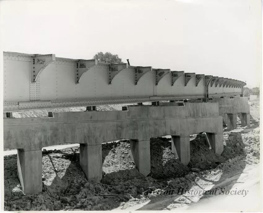 Print. Black and white photographic print with a slight sepia tone depicting the construction of the interchange between I-94 and M-10 taken of the bents and unfinished deck of an overpass above an unfinished expressway. As the overpass is curved and its bents have at least six columns, this is most likely the interchange ramps between the two expressways. The bents are surrounded by loose piles of dirt, as paving has not yet begun below. The top of a crane is visible in the background over the overpass.