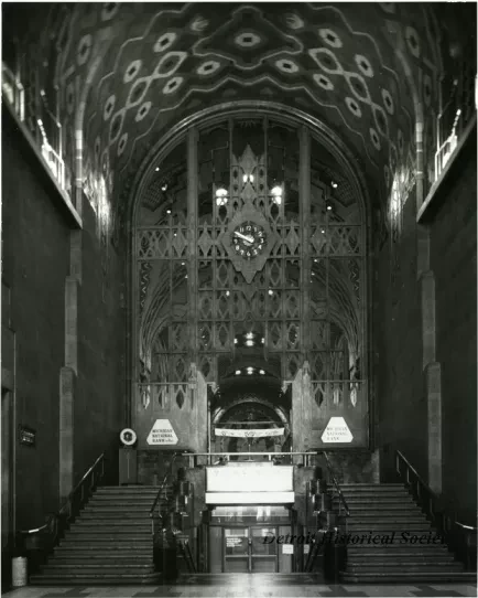 Black and white photographic print of the lobby of the Union Trust Building (Guardian Building). The photograph is mounted on board and was taken as part of the Historic American Buildings Survey.