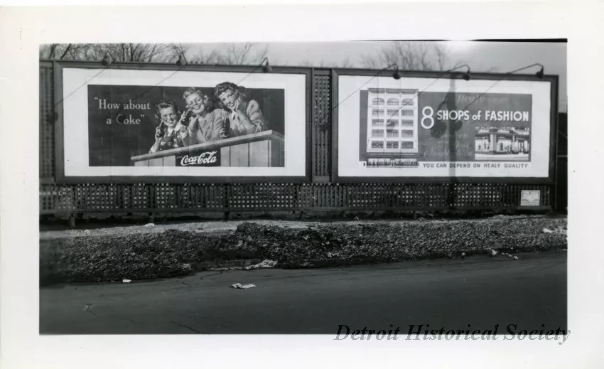 Black and white photographic print depicting two Walker & Co. billboards. One displays an advertisement for Coca-Cola reading, "'How about a Coke', Drink Coca-Cola", and showing three young women. The other displays an advertisement for Healy Shops reading, "8 Shops of Fashion, Downtown and in Your Neighborhood, You Can Depend on Healy Quality".